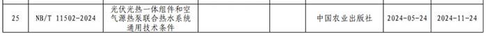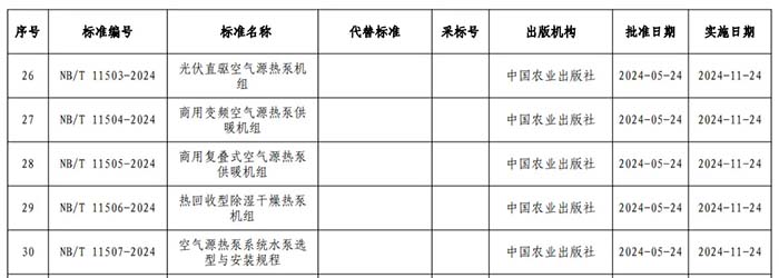 近日,国家能源局官网发布2024年第2号公告,批准NB/T 11502-2024《光伏光热一体组件和空气源热泵联合热水系统通用技术条件》、NB/T 11503-2024《光伏直驱空气源热泵机组》、NB/T 11504-2024《商用变频空气源热泵供暖机组》、NB/T 11505-2024《商用复叠式空气源热泵供暖机组》、NB/T 11506-2024《热回收型除湿干燥热泵机组》、NB/T 11507-2024《空气源热泵系统水泵选型与安装规程》,将于2024年11月24日起实施。