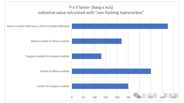 具有自润滑特性的碳化硅材料广泛应用于机械密封中。在运动部件的配对选择上,通常采用不同硬度的材料以尽量减少摩擦。密封环组合的选择尤为关键,其中最常用的组合是碳环与碳化硅环(参见图2,常见面组合的压力x周速 - PxV系数)。这种组合不仅具备出色的导热性和耐化学性,还能有效抵抗流体中磨料颗粒造成的磨损。