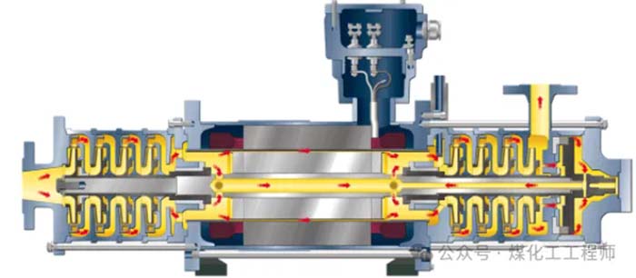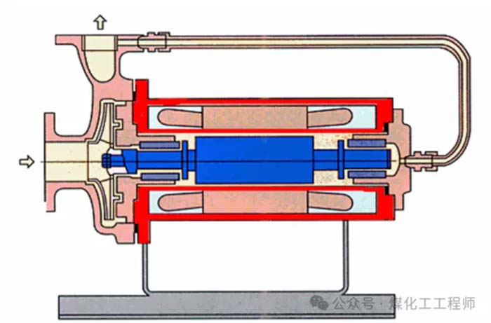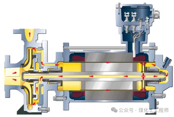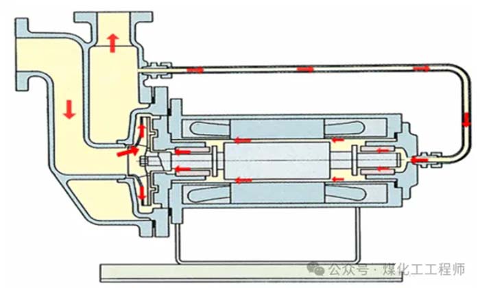 单级泵:部分流体从出口流经电机,经辅助叶轮二次加压后流回出口,使得电机腔内的压力与出口压力保持一致。