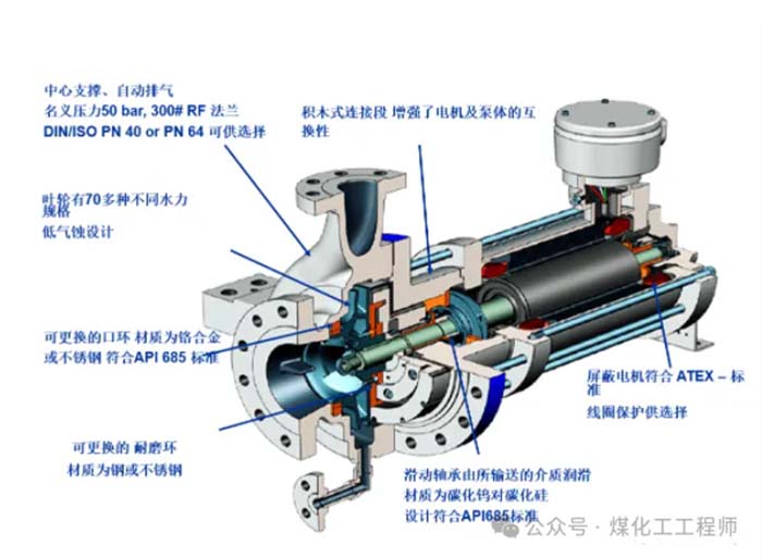 4、采用输送介质润滑的石墨滑动轴承,使运行噪声更低且无需人工加油,降低了维护成本;近几年轴承材质又增加有碳化硅SIC,超硬等,使用寿命优于石墨轴承。