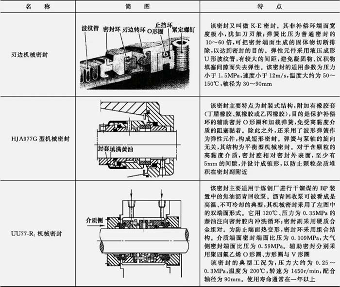 在石油化工和炼油装置中所应用的温度较高的热油泵有塔底热油泵、热载体泵、油浆泵、渣油泵、蜡油泵、沥青泵、熔融硫黄和增塑剂泵等,均采用机械密封。在高温油泵中采用硬对硬摩擦副解决低压含固体颗粒的减压塔底热油泵机械密封,采用焊接金属波纹管机械密封解决不同压力下的热油泵密封,采用轴封箱冷却套降低温度解决热油泵密封,采用翅片冷却轴封箱保护辅助密封解决热油泵密封以及采用双端面密封和加强冲洗等措施。见表 1。